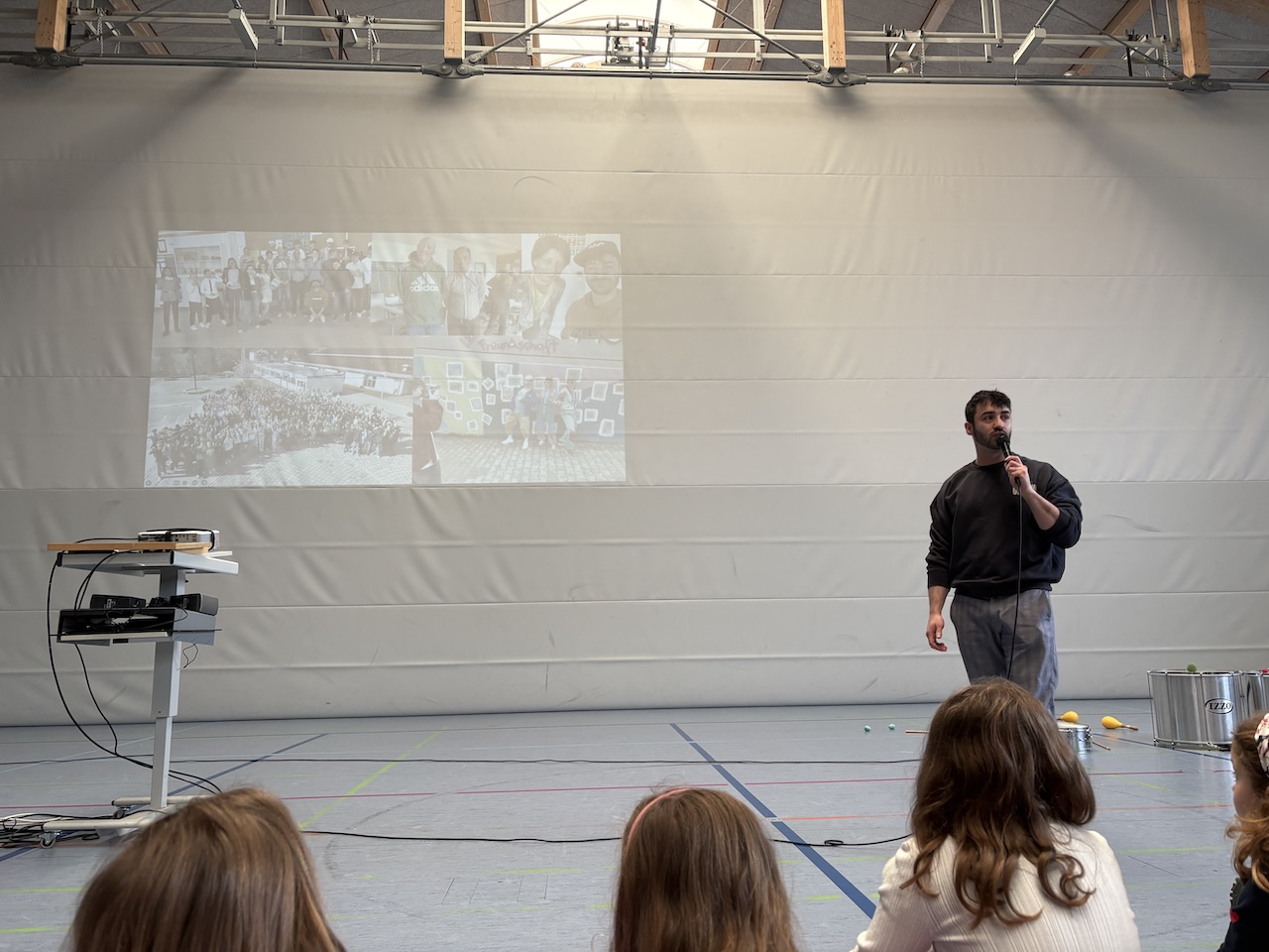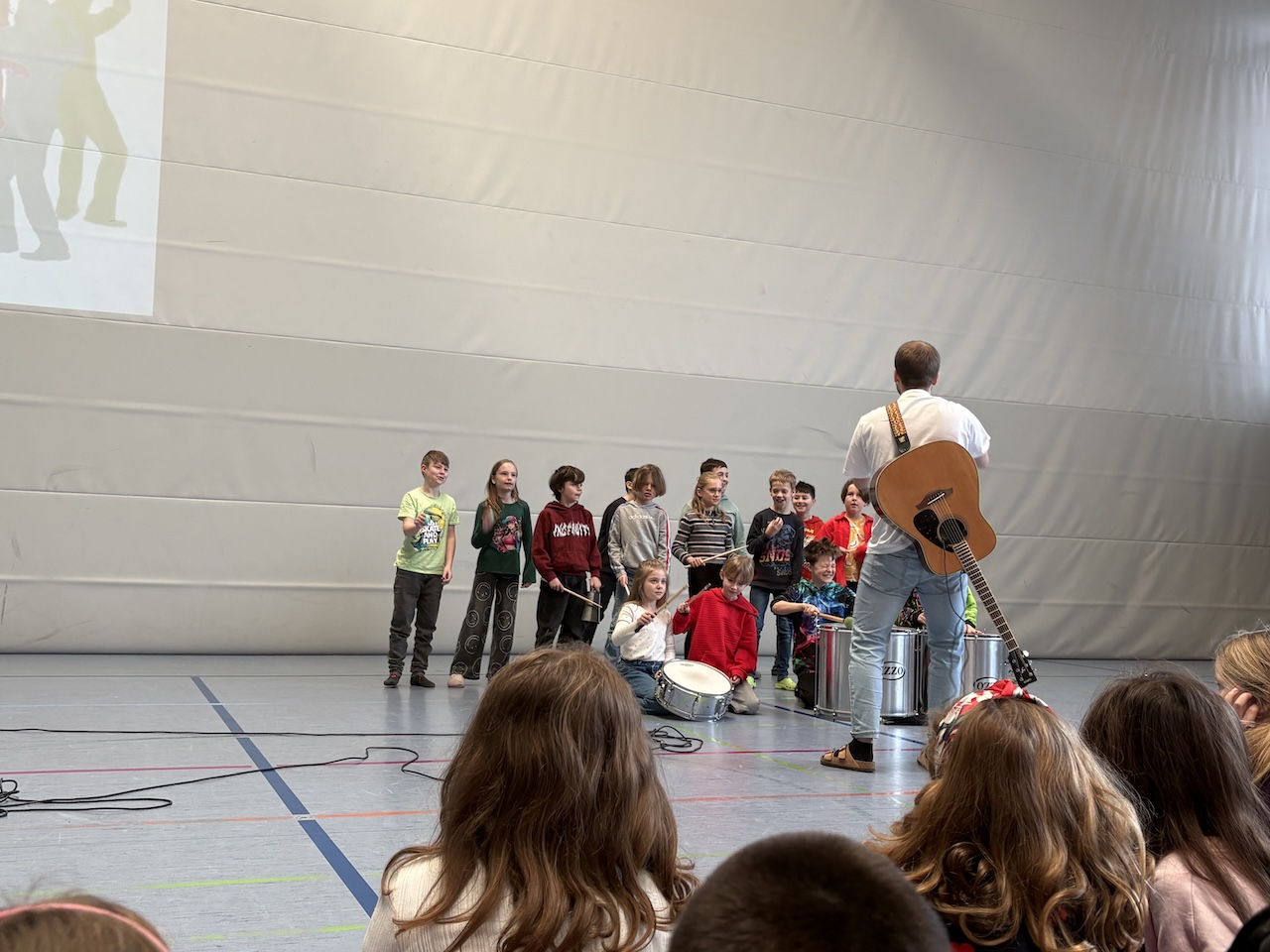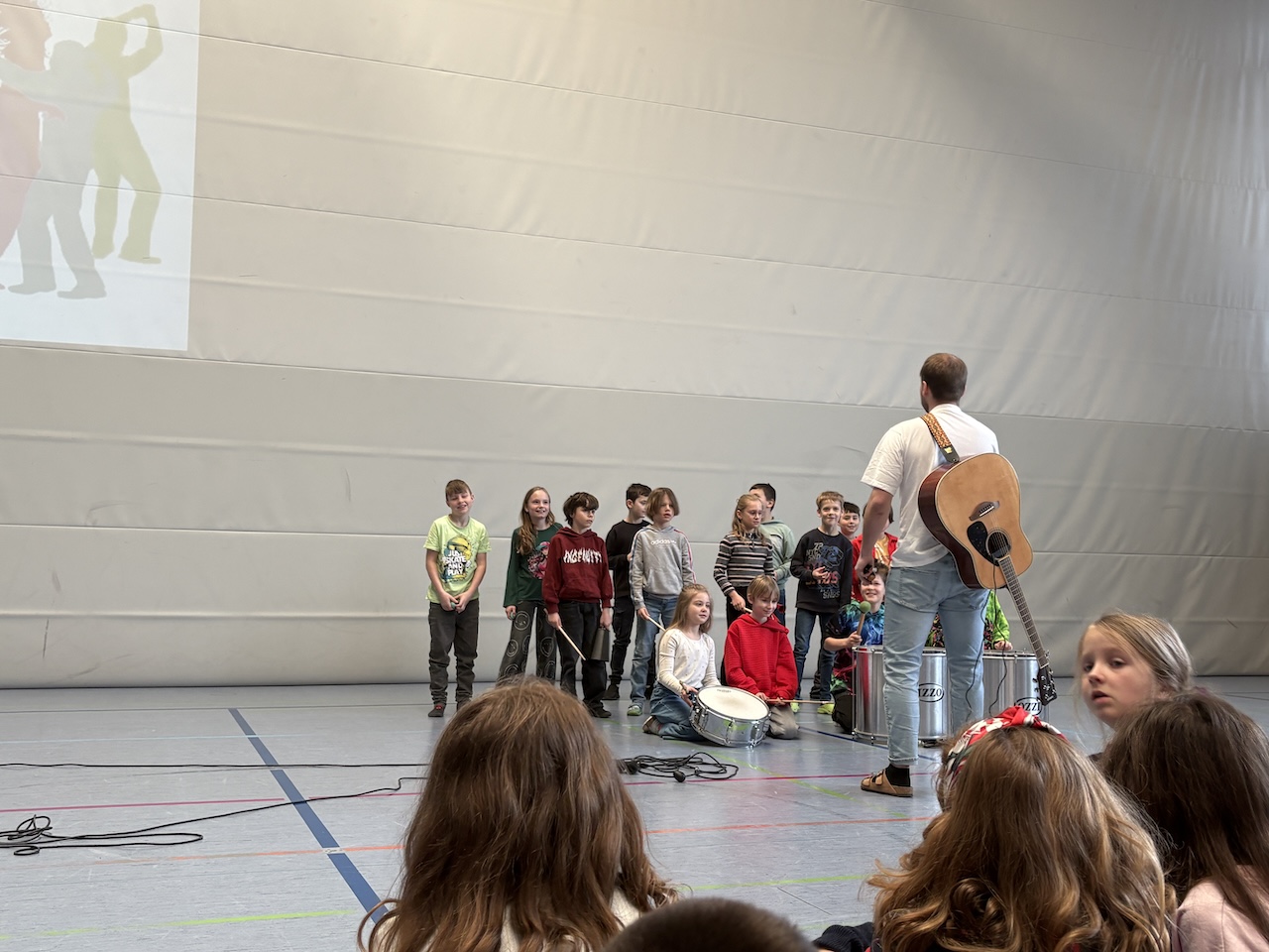 Für den schwungvollen Abschluss sorgte die Klasse 3b mit ihrem Lehrer Herrn Baldes. Mit Trommeln, Rhythmus und Sprechgesang brachten sie echte Samba-Stimmung in die Aula.